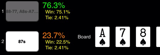 Scott: You’re not ahead of a ton of his hands. A7, A8, 77, 88 yeah all have you drawing dead or almost dead. Think about the entire range you’re facing when called. You’re either a tiny bit ahead or crushed!!!!